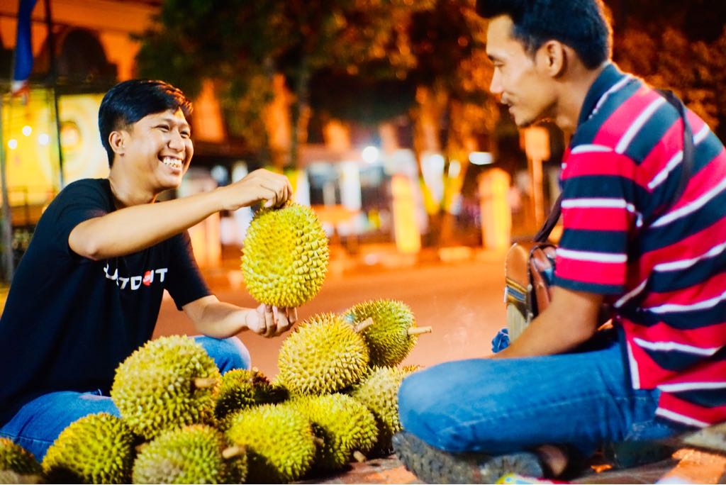 Deretan pedagang buah Durian berjajar menawarkan sensasi kenikmatan lidah santap Durian berbagai varian. Ada jenis Durian Montong dan lokal semua tersaji mulai harga Rp. 35 ribu hingga Rp. 65 ribu.