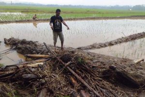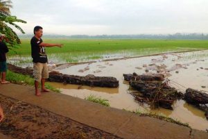 “Tanggul Sungai Citalahab kembali jebol karena tidak kuat menahan derasnya volume air sungai, sehingga air langsung mengalir ke persawahan milik warga,” ujar salah seorang anggota DPRD Kabupaten Ciamis, Drs. Wagino saat ditemui di lokasi tanggul Sungai Citalahab yang kembali jebol, Rabu (19/04) pagi.