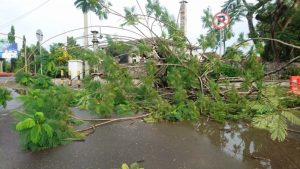 Berdasarkan pantauan Warta Priangan, pohon yang terletak di bundaran Pos Polantas Polsek Pangandaran ini roboh dan tercerabut akarnya, menimpa pagar, kabel listrik dan sebagian badan jalan.