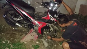 Dari arah berlawanan datang bus patas angkutan umum yang belum diketahui identitasnya dan menggilas sepeda motor bagian depan hingga rusak berat.
