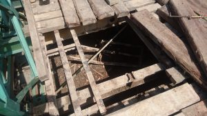 Mereka telah membongkar sebagian bantalan dan tinggal menyambung pengganti bantalan besi yang rusak.