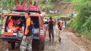 Satgas PB BPBD dan Warga, Singkirkan Material Longsor yang Menutup Jalan di Ciamis