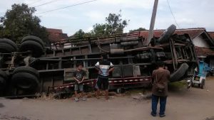 “Tadi, truk juga jalannya beriringan dengan tiga truk lain yang ada di depannya, tapi tidak masalah. Truk saya yang terakhir apes malah terguling,” katanya.