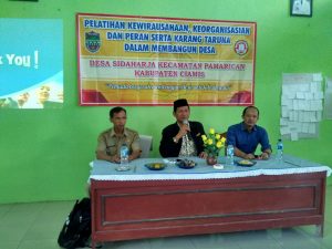 wartapriangan.com, BERITA CIAMIS. Sebanyak kurang lebih 30 anggota Karang Taruna di Desa Sidaharja, Kecamatan Pamarican, Kabupaten Ciamis, Jawa Barat, mengikuti pelatihan kewirausahaan dengan tema “Pelatihan Kewirausahaan, Keorganisasian, dan Peran Serta Karang Taruna Dalam Pembangunan Desa”, bertempat di Aula Balai Desa Sidaharja, Selasa (26/07)