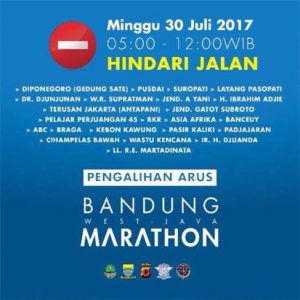 Beberapa ruas jalan di Kota Bandung yang menjadi jalur yang dilewati peserta marathon akan ditutup mulai pukul 05.00 hingga 12.00 WIB dan warga Bandung dihimbau untuk menghindari jalanan berikut ini.