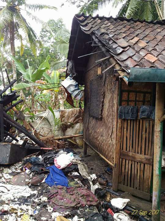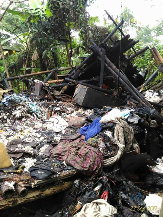 Solihin menyampaikan, kebakaran terjadi akibat korek gas meledak dekat tungku, lalu api menyambar ke dinding rumah yang terbuat dari bilik bambu. Rumah panggung yang dihuni keluarganya, kini hangus terbakar dilalap si jago merah.