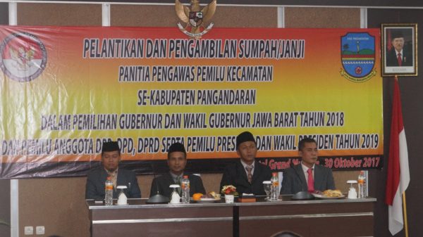 wartapriangan.com, BERITA PANGANDARAN. Sebanyak 30 anggota Panitia Pengawas Kecamatan (Panwascam), Senin (30/10/2017) siang ini, secara resmi dilantik, di aula salah satu hotel di Pantai Barat Pangandaran.
