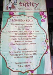 Lamaran dikirimkan langsung ke Toko Tatity, Jalan Stasiun/Samping Toserba Yogya Ciamis