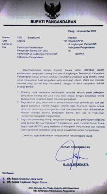 wartapriangan.com, BERITA PANGANDARAN. Bupati Pangandaran, H. Jeje Wiradinata telah menandatangani surat edaran nomor 027/ -Barjas/2017. Penandatanganan surat tersebut bentuk tindakan tegas pemerintan yang tidak akan membayar seluruh paket pekerjaan pengadaan barang dan jasa yang tidak sesuai dengan spesifikasi yang telah ditentukan. Selain itu pemda akan memblacklist rekanan yang tidak menindaklanjuti hasil temuan pemeriksaan baik itu internal atau eksternal.