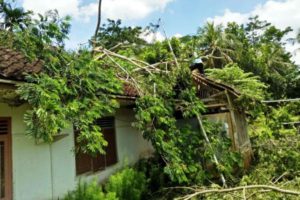 Hembusan angin yang cukup kencang membuat pohon albasiah yang ada di RT 05 Dusun Cikondang, Desa Bunter, Kecamatan Sukadana roboh. Pohon tersebut kemudian menimpa rumah warga.