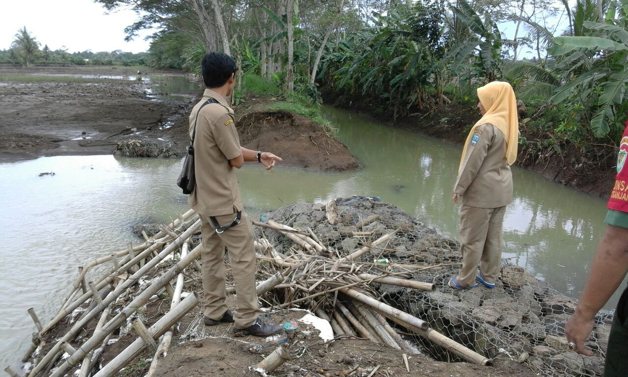 wartapriangan.com, BERITA PANGANDARAN. Petugas Satgas Penanggulangan Bencana dari Dinas DPKPB Kabupaten Pangandaran melakukan peninjauan untuk menindaklanjuti penayangan berita jebolnya tanggul sungai di salah satu stasiun televisi swasta nasional, Senin (27/11/2017). Adapun lokasi kejadiannya di Sungai Batas, Dusun Babakansari Desa Ciganjeng Kecamatan Padaherang, sekira pukul 14.57 WIB