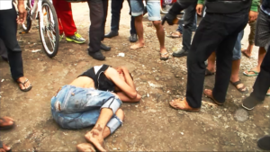 Meski pelaku menangis serta berteriak meminta ampun, massa yang tak terkendali terus melakukan aksi main hakim sendiri. Ketiga pelaku dipukuli, ditendang, ditelanjangi, diseret hingga tersungkur di aspal.
