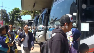 Puluhan penumpang yang hendak berangkat menuju luar kota terpaksa diturunkan untuk pindah menggunakan bus lain.