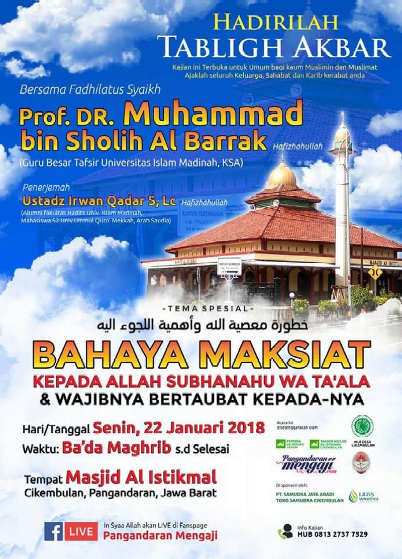 wartapriangan.com, BERITA PANGANDARAN. Sebuah Tabligh Akbar dengan tema “Bahaya Maksiat Kepada Allah Subhana Wa Ta’ala & Wajibnya Bertaubat Kepada-Nya“ akan digelar di Masjid Al Istikmal, Desa Cikembulan, kecamatan Sidamulih, Kabupaten Pangandaran, ba’da Magrib sampai dengan selesai, Senin 22 Januari 2018, mendatang.