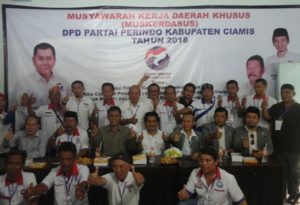 Pasangan H. Herdiat Sunarya dan Yana D. Putra bersama sejumlah tim menghadiri Musyawarah Kerja Daerah Khusus (Muskerdasus) DPD Perindo Kabupaten Ciamis di Jalan Ahmad Yani no 57 Ciamis, Kamis (18/01/2018).