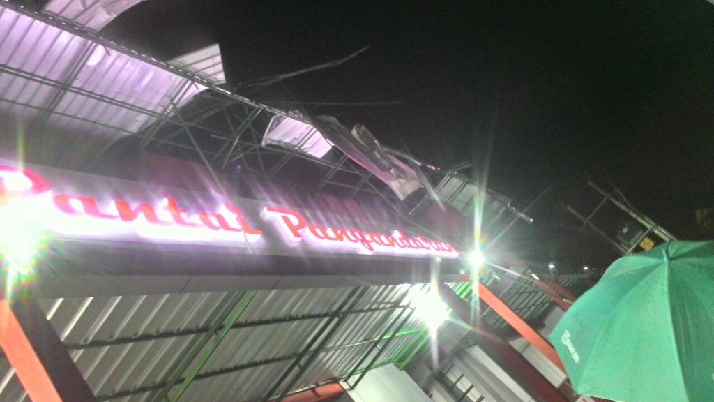 Seperti atap bangunan tolgate utama Pantai Pangandaran, yang terbuat dari baja ringan beterbangan diterjang angin. Akibatnya jalur tolgate sempat ditutup sementara untuk keselamatan pengendara motor maupun mobil.