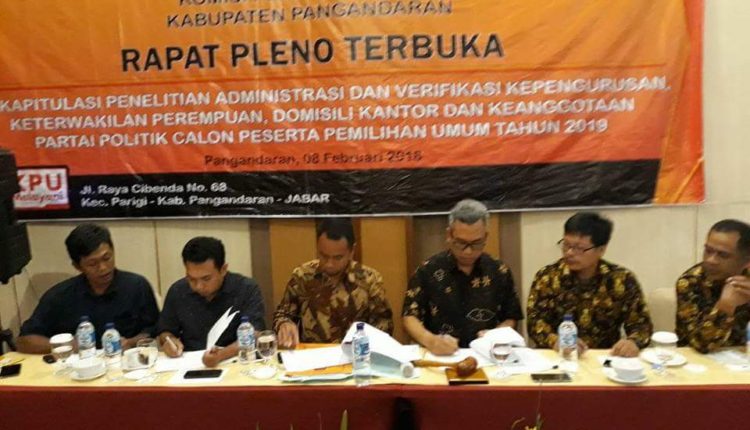 Hal tersebut sesuai dengan hasil rapat pleno terbuka mengenai rekapitulasi penelitian administrasi dan verifikasi kepengurusan, keterwakilan perempuan, domisili kantor dan keanggotaan partai politik calon peserta pemilu 2019 yang diselenggarakan di Hotel Horizon Palma Pangandaran, Kamis (8/2/2018) siang tadi.