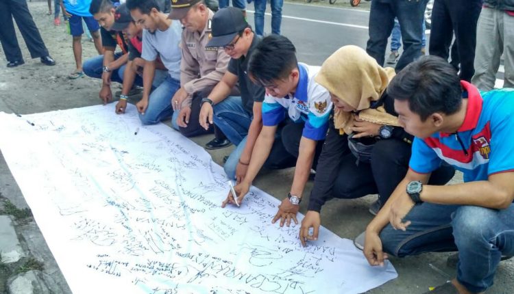 wartapriangan.com, BERITA PANGANDARAN. Sejumlah pemuda di Kecamatan Kalipucang, Kabupaten Pangandaran, Sabtu (26/5/2018), berkumpul untuk melakukan deklarasi penggalangan komitmen bersama penolakan terhadap segala bentuk aksi terorisme yang diakhiri dengan pembagian takjil kepada pengguna jalan dan masyarakat sekitar.