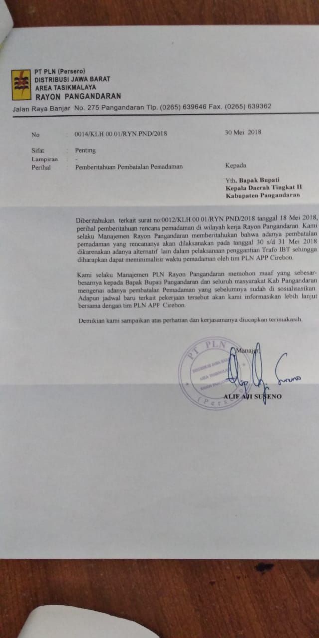 wartapriangan. com, BERITA PANGANDARAN. PLN Rayon Pangandaran dalam surat resminya menyampaikan pembatalan pemadaman aliran listik yang direncanakan akan berlangsung di tujuh kecamatan di Kabupaten Pangandaran, pada 30 sampai dengan 31 Mei 2018.
