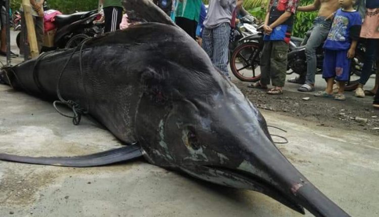 Ikan blue marlin ini ditangkap seorang nelayan bernama Ehem warga Bojongsalawe, Desa Karangjaladri, Kecamatan Parigi, Kabupaten Pangandaran, saat melaut.