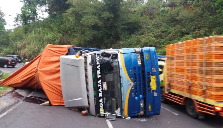 Tak Kuat Menanjak, Truk Pengangkut Kayu Terguling di Tanjakan Gentong