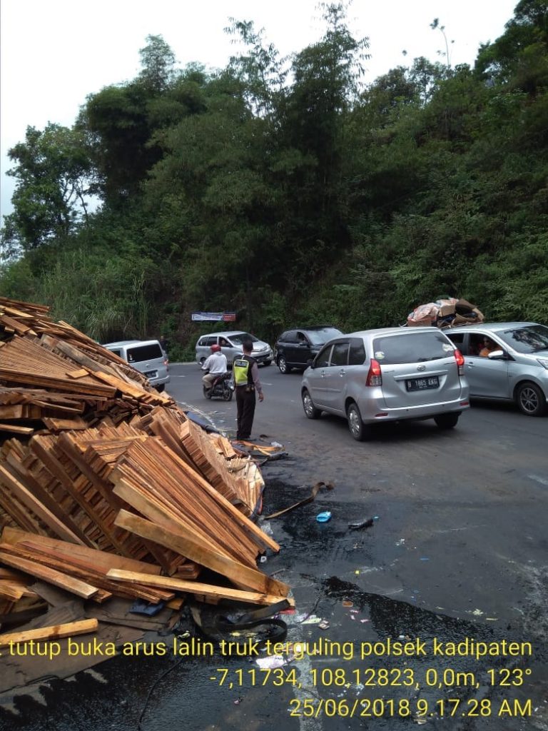 Z 9261 TD, Senin (25/06/2018) terguling di Jalan Gentong,Kecamatan Kadipaten, Kabupaten Tasikmalaya. Diduga truk tersebut kelebihan muatan.