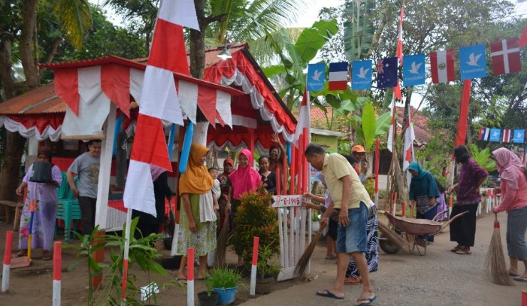 Secara gotong-royong warga menghias jalan dengan tiang yang dicat warna merah putlh, memasang umbul umbul dan bendera merah putih di halaman rumah warga.