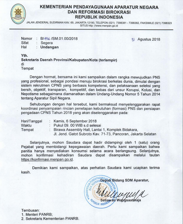 Di surat itu, dicantumkan MenPAN RB mengundang 525 Sekretaris Daerah Provinsi/Kabupaten/Kota untuk menghadiri rapat yang akan digelar pada hari Kamis, 6 September 2018 di Birawa Assembly Hall, lantai 1, Jl. Gatot Subroto, RT.8/RW.8, Menteng Dalam, Tebet, Kota Jakarta Selatan.