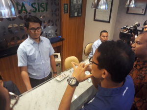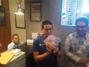 “Walaupun saya bilang saya tukar, kayaknya perlu pencitraan seperti ini (menukarkan dollar secara langsung),” kata Sandiaga di sela-sela kegiatannya.