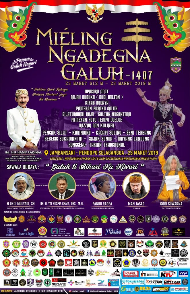 Diketahui acara Miéling Ngadegna Galuh akan dilaksanakan pada tanggal 23 Maret 2019 bertempat di Situs Jambansari dan Pendopo selagangga Kabupaten Ciamis. (SH)