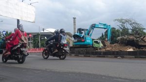Dari pantauan Warta Priangan, tampak para pekerja tengah membongkar patung tiga ikan tersebut dengan menggunakan bekho dan membuang matrial bekas bongkaran dengan menggunakan dump truk.