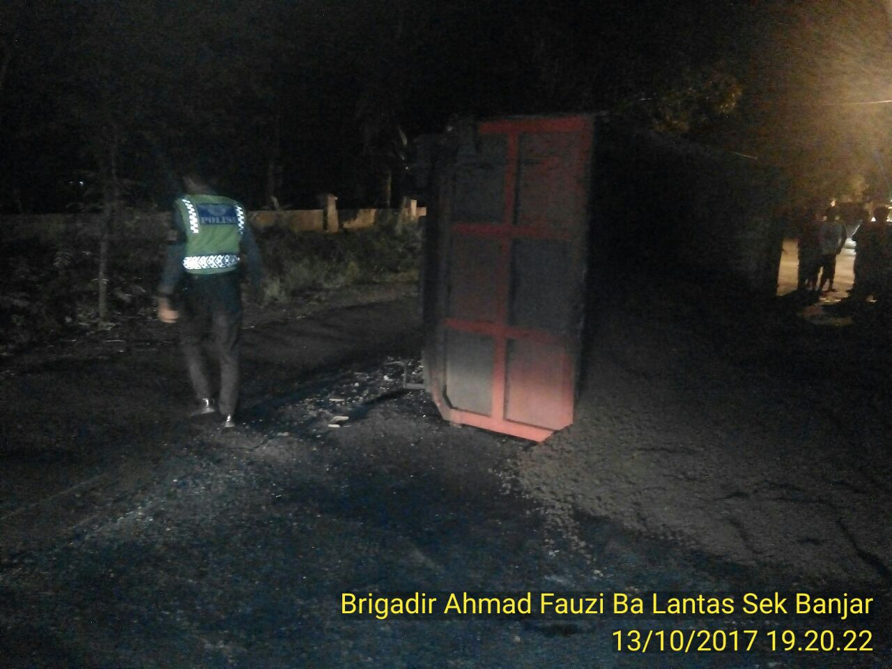 Menurut keterangan Kapolsek Banjar Kompol Endin Wahyudin, SH,. bahwa kronologis musibah tergulingnya mobil truk pengangkut pasir tersebut diakibatkan, karena ring as belakang sebelah kiri patah, sehingga menyebabkan truk terguling ke sebelah kanan jalan.